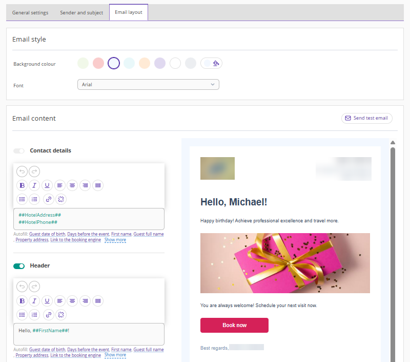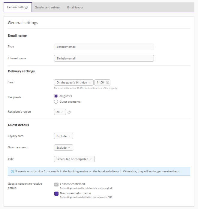 In the Exely extranet, go to "Guest management" > "Guest relations" > "Emails", click "Create an automated email", and select “Birthday email”. The "General settings" tab will be opened. For more details on how to create an automated email, see the article "How to create automated emails in Exely Guest Relations".