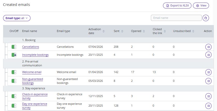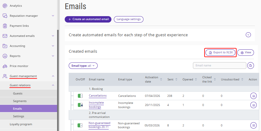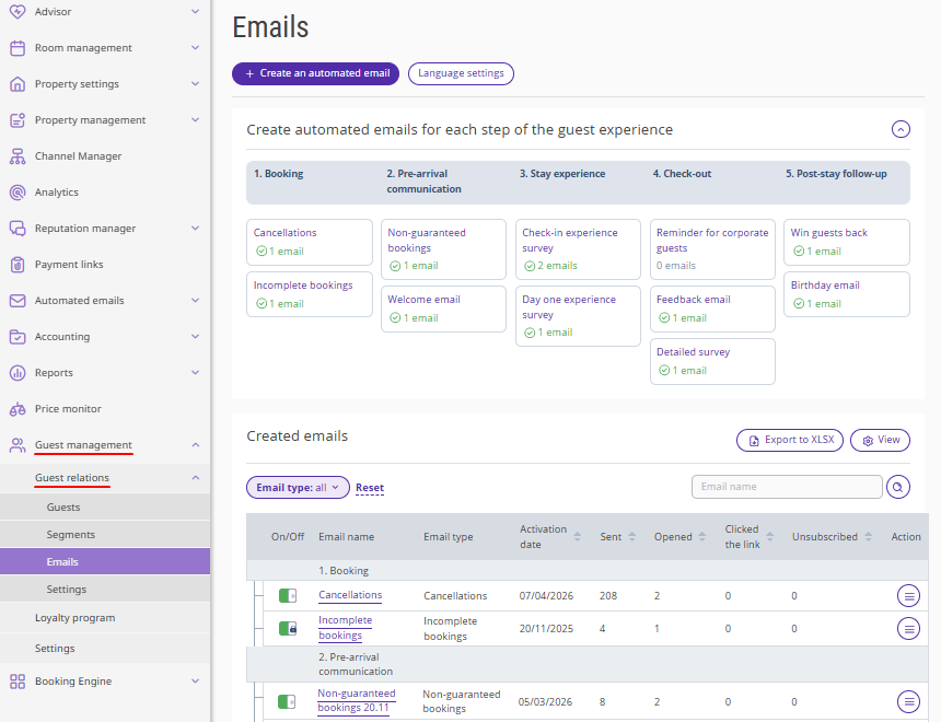 In the Exely extranet, in the "Guest management" > "Guest relations" > "Emails" section, all active and inactive automated emails are displayed.