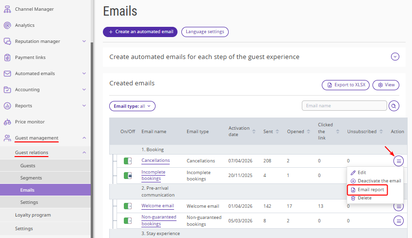 When working with automated emails in Exely Guest Relations, you can generate and download three types of reports: