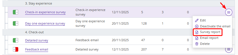 2. In the “Created emails” table, find an automated email with a survey form and click "Action" > "Survey report".
