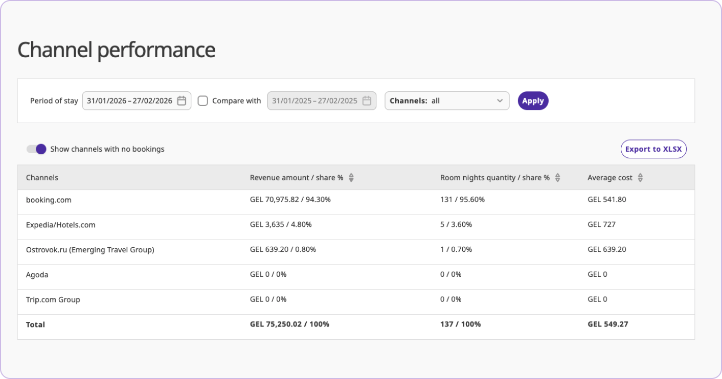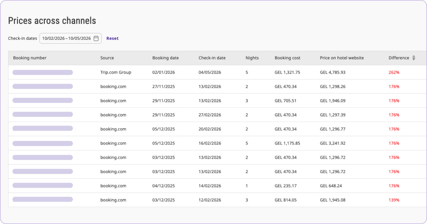 Understand which channels generate profitable bookings, where price disparities appear, and how channel contributes to revenue.