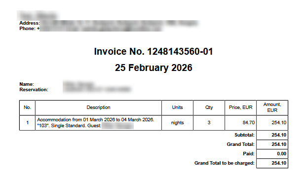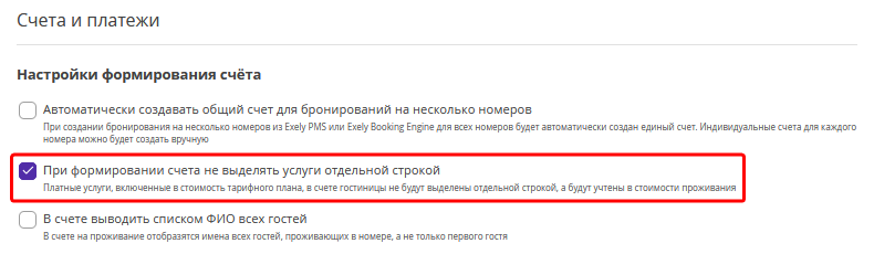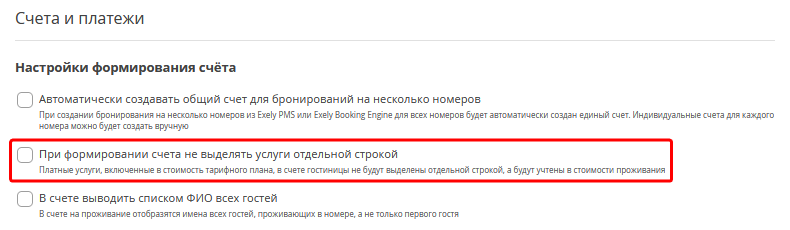 Если функция «При формировании счета не выделять услуги отдельной строкой» включена, то в счете будет отображаться только одна строка, без отображения услуг, включенных в стоимость проживания.