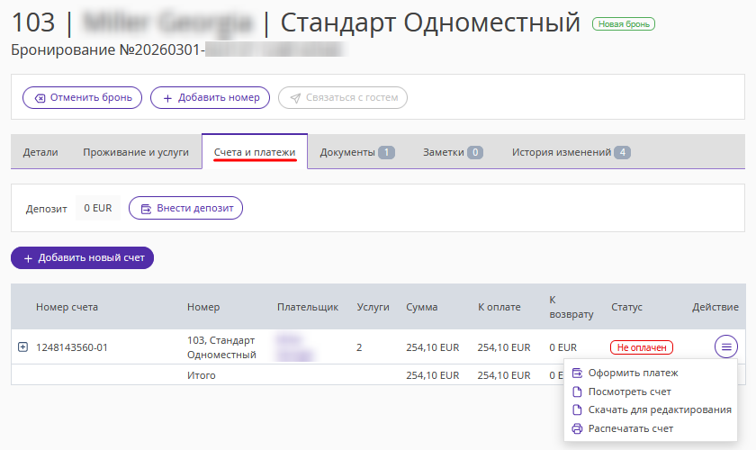 3. Откроется карта номера. Перейдите на вкладку «Счета и платежи». Здесь указаны все счета, сформированные автоматически по бронированию.