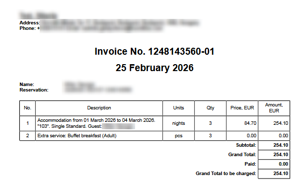 Обратите внимание. Если в разделе «Управление отелем» → «Настройки» на вкладке «Общие настройки» в блоке «Настройки формирования счета» НЕ включена функция «При формировании счета не выделять услуги отдельной строкой», то счет на бронирование по тарифу с включенным завтраком будет содержать две строки — информацию о включенной услуге на сумму 0 и сумму за проживание.