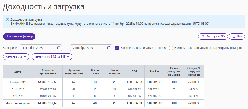Доход за проживание считается по номероночам. В примере мы смотрим отчет с 1 ноября по 2 ноября 2025 г. Если есть бронирование, которое частично попадает в выбранный период, то в отчет попадет доход только за дни, попадающие в указанный период.