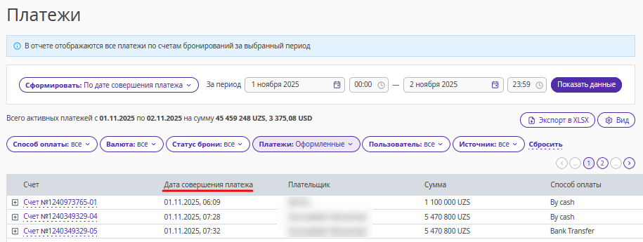 «Отчет по платежам», условно говоря, заходит во все оплаченные (полностью или частично) бронирования и смотрит дату оплаты, а также сумму.