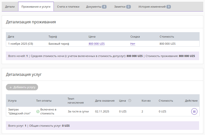 Таким образом, по данному бронированию доход за проживание = 800 000 - 0 = 800 000 сум.