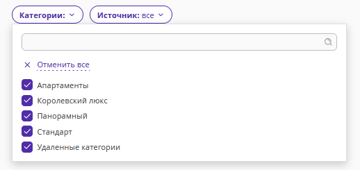 Чтобы сформировать отчет на одну или несколько интересующих категорий номеров, используйте фильтр по категориям номеров.