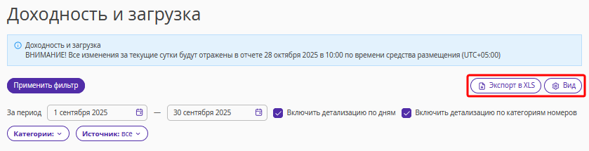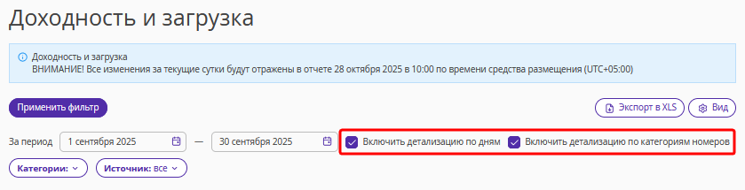 Чтобы сгруппировать данные по категориям номеров, отметьте пункт «Включить детализацию по категориям номеров».