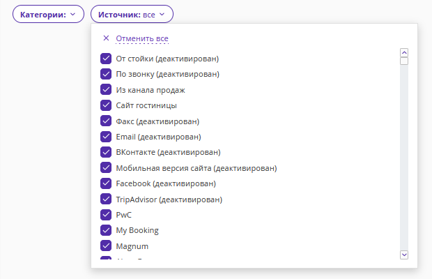 Чтобы сформировать отчет по одному или нескольким источникам, используйте фильтр по источникам.