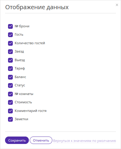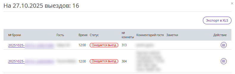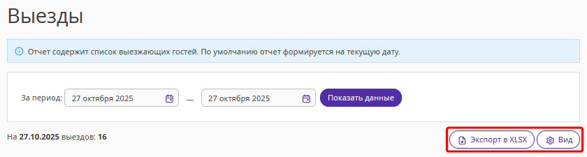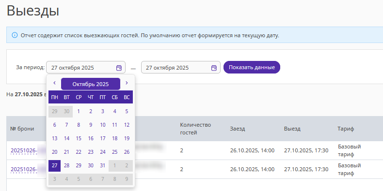 В отчете «Выезды» содержится список выезжающих гостей. По умолчанию отчет формируется на текущую дату.