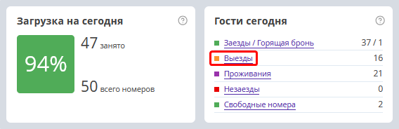 Для быстрого доступа к отчету в шахматке броней в блоке статистики «Гости сегодня» кликните на ссылку «Выезды».