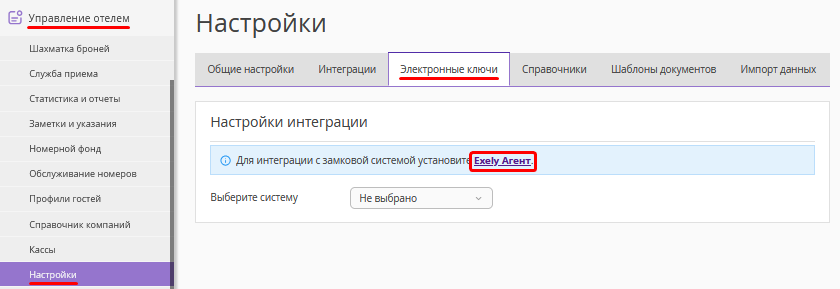 В разделе «Управление отелем» перейдите в подраздел «Настройки» → «Интеграции» или «Настройки» → «Электронные ключи». Скачайте Exely Агент и настройте его. Подробности смотрите в инструкции «Как установить и настроить Exely Агент».