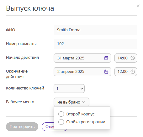 Срок действия ключа автоматически выбирается в соответствии со временем заезда и выезда гостя. Выберите количество ключей и нажмите кнопку «Подтвердить».