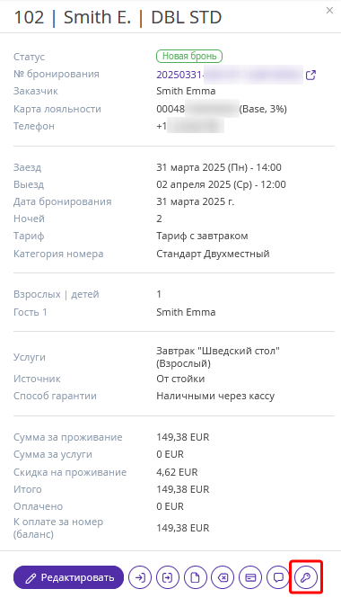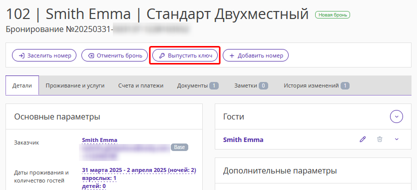 Чтобы выдать гостю ключ от забронированного номера, кликните левой кнопкой мыши на бронирование в шахматке и нажмите кнопку «Выпуск ключа» в открывшемся окне.