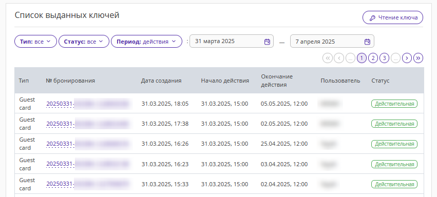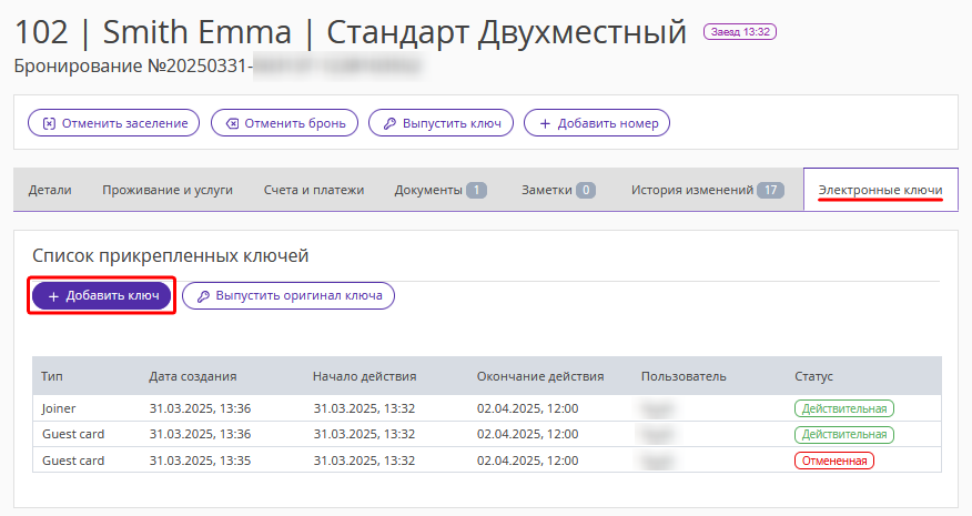 3. В списке выданных ключей отображаются строки с действующими картами «Guest card» — ключ-карта первого гостя, и «Joiner» — дополнительная ключ-карта второго гостя. Все предыдущие ранее выпущенные ключ-карты блокируются и перейдут в статус «Отмененная».