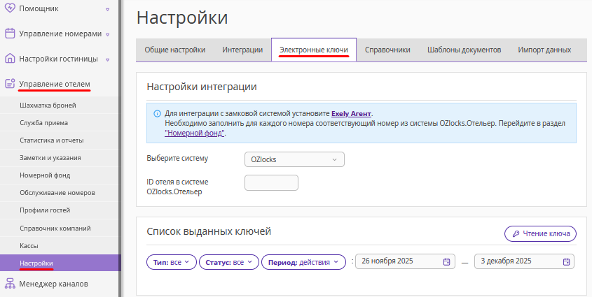 В экстранете Exely перейдите в раздел «Управление отелем» → «Настройки» → вкладка «Электронные ключи» и выберите систему OZLocks. ID отеля скопируйте из OZLocks.
