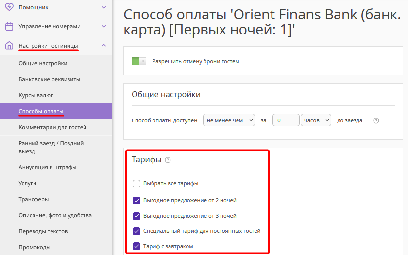 5. Активируйте способ оплаты для нужных тарифов. В разделе «Настройки гостиницы» → «Способы оплаты» нажмите на название способа оплаты. В блоке «Тарифы» отметьте галочками тарифы и сохраните.