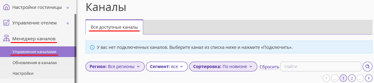 В экстранете Exely перейдите в раздел «Менеджер каналов» → «Управление каналами». Во вкладке «Все доступные каналы» найдите нужный канал и нажмите на кнопку «Подключить».