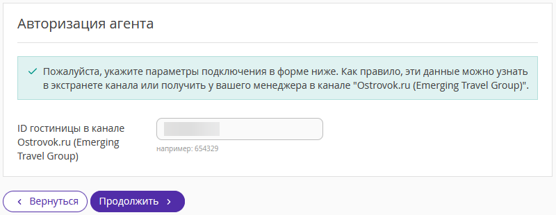 Добавьте данные для авторизации вашей гостиницы, полученные от канала продаж, и нажмите на кнопку «Продолжить».