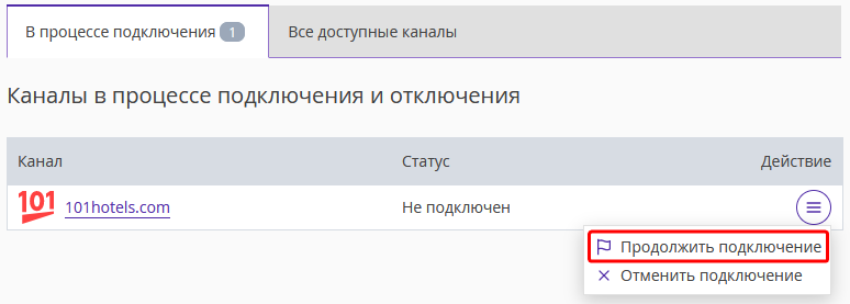 Нажмите на название канала или нажмите на кнопку «Действие» и выберите «Продолжить подключение».