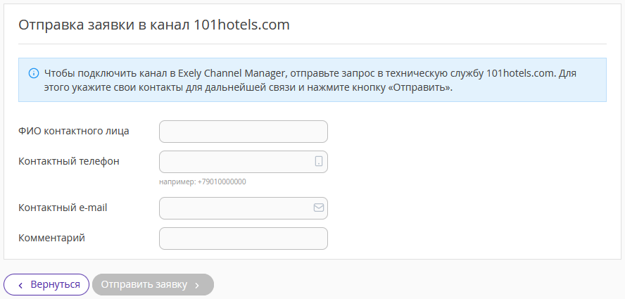 На втором шаге заполните и отправьте в канал продаж заявку на подключение к Exely Channel Manager. Время ответа зависит от канала, обычно не больше семи дней.