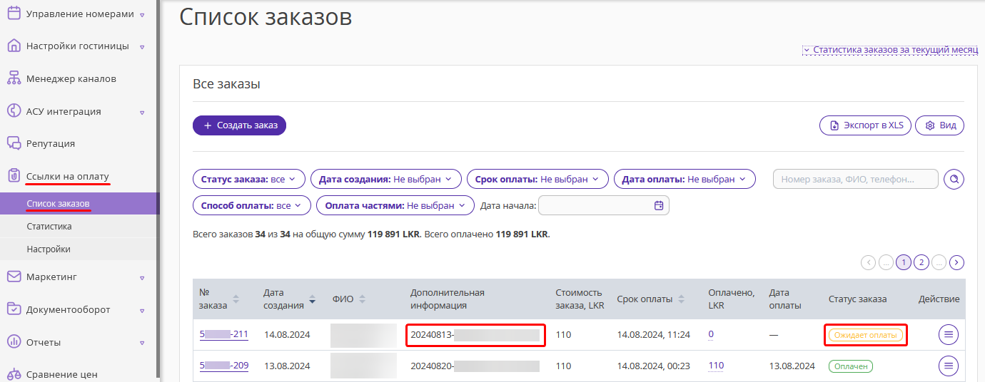 В разделе «Ссылки на оплату» → «Список заказов» отобразится заказ по бронированию со статусом оплаты.