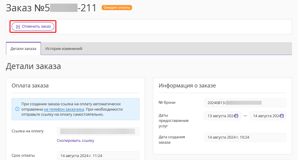 В разделе «Ссылки на оплату» → «Все заказы» введите в поисковой строке номер бронирования. Вы увидите все заказы, созданные через кнопку «Получить оплату» в бронировании.
