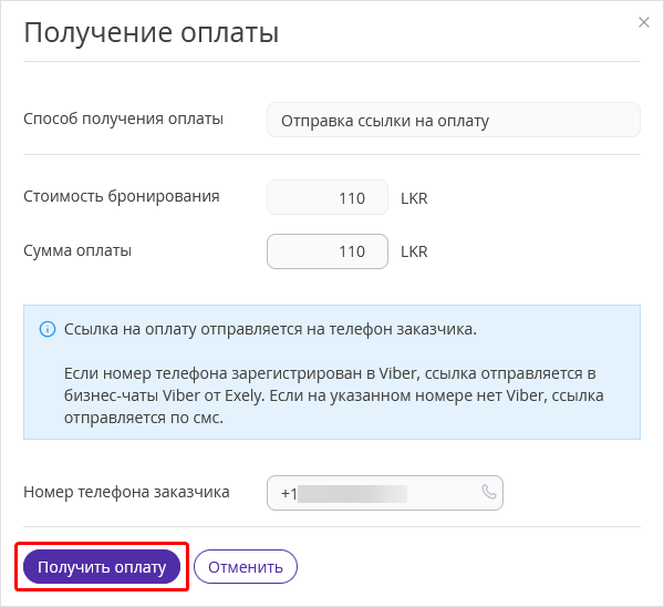 Гостю уйдет ссылка на оплату. Ссылка отправляется в бизнес-чаты в Viber на номер телефона гостя, указанный в заказе. Если гость не использует Viber, ссылка придет в СМС. Все сообщения отправляются от имени Exely.