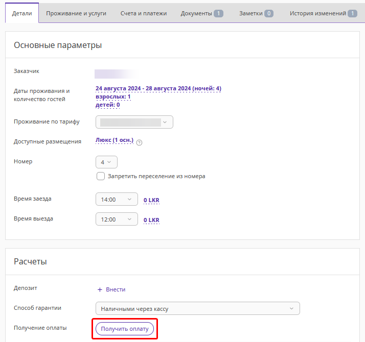 Или в разделе «Управление отелем» → «Шахматка броней» нажмите на бронирование → «Редактировать». В открывшейся карточке брони на вкладке «Детали» нажмите «Получить оплату».