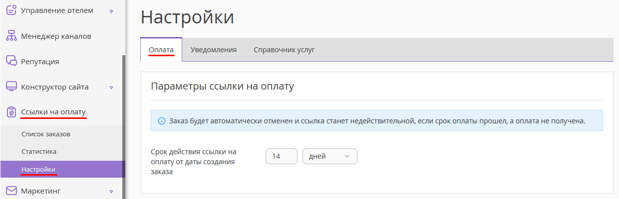 Срок действия ссылки, созданной в Exely Payment Links и через кнопку «Получить оплату» в шахматке, зависит от установленного времени в разделе «Ссылки на оплату» → «Настройки» → «Оплата» → блок «Параметры ссылки на оплату».