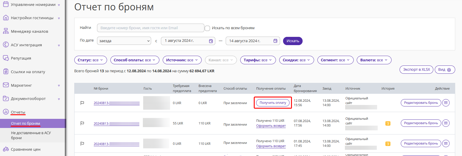 1. В экстранете Exely перейдите в раздел «Отчеты» → «Отчет по броням», найдите нужное бронирование и нажмите кнопку «Получить оплату».