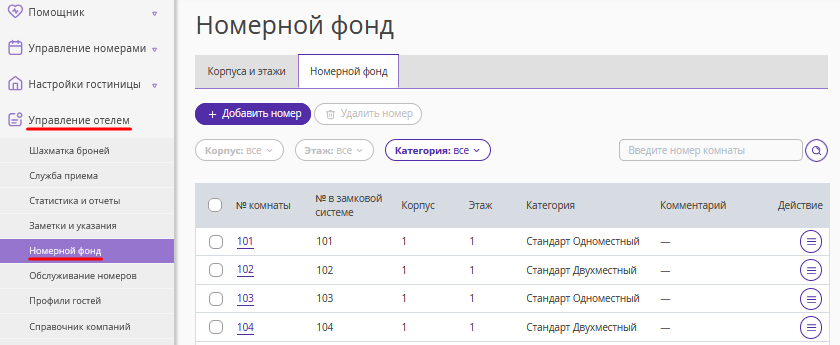 2. Во вкладке «Номерной фонд» каждой комнате присваивается свой номер. Используйте номера замковой системы AdemLock.