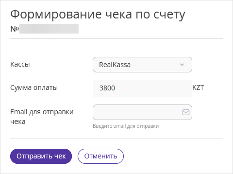 В открывшемся окне формирования чека из списка касс выберите кассу и укажите email плательщика, на который будет отправлена ссылка на чек.