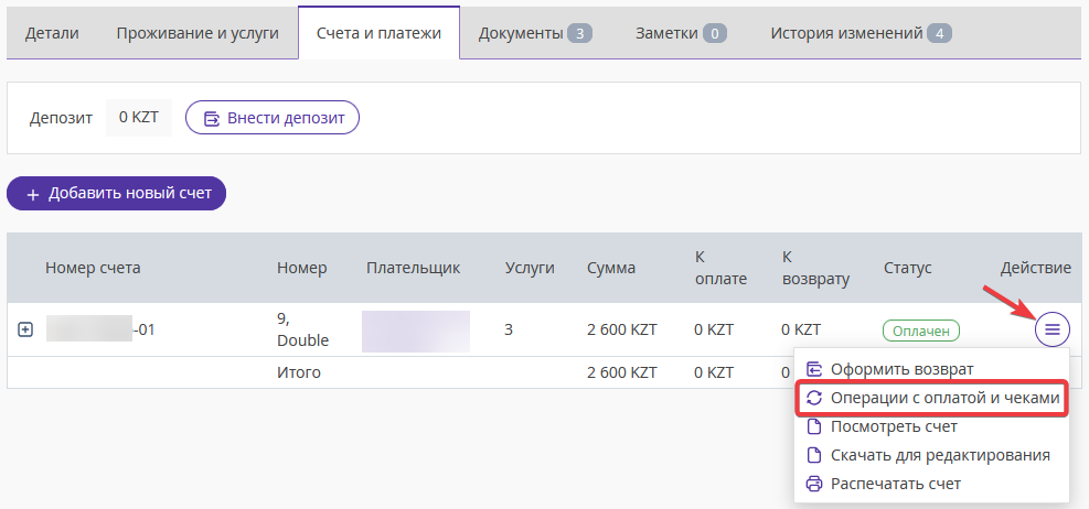 Для оформления возврата по счету перейдите в карту бронирования на вкладку «Счета и платежи», нажмите кнопку «Действие» и выберите «Оформить возврат».