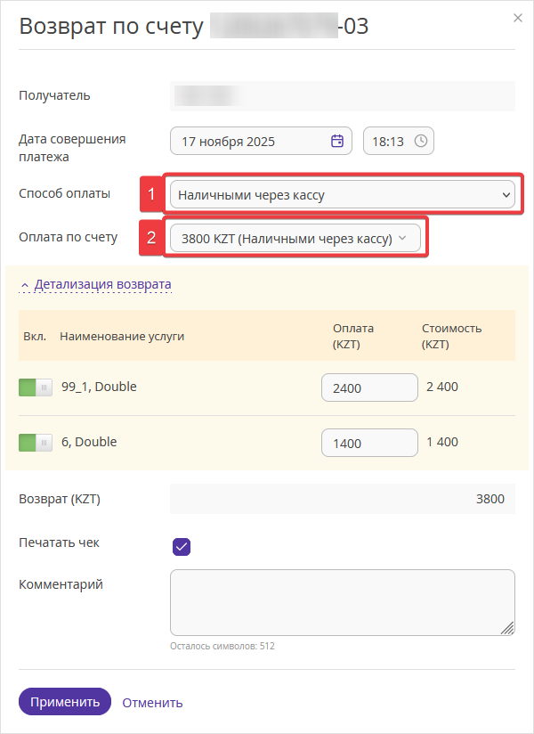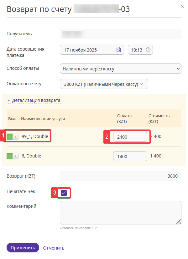 В блоке «Детализация возврата» выберите услугу для возврата с помощью переключателя (1). Также можете уменьшить сумму к возврату по позиции счета — для этого отредактируйте сумму в колонке «Оплата» (2). Если вам не нужен чек на эту операцию, уберите галочку «Печатать чек» (3) и нажмите «Применить».