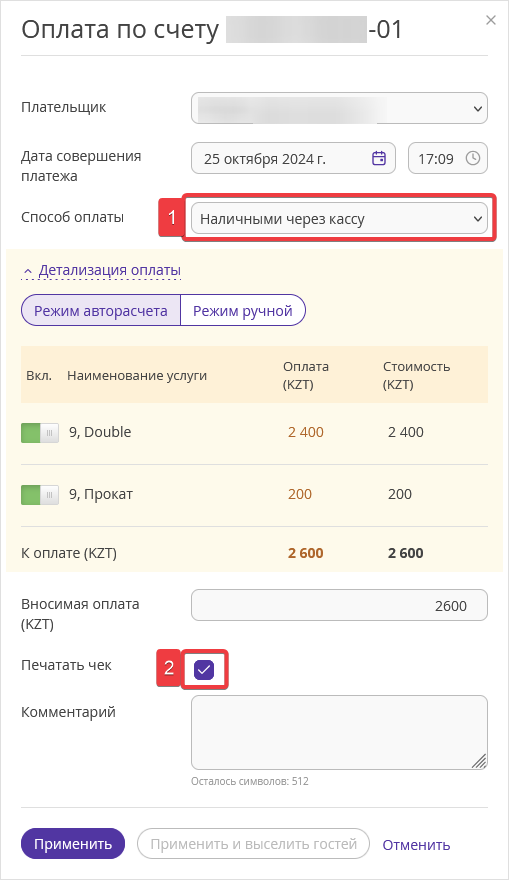 Если вам не нужен чек на эту операцию, уберите галочку «Печатать чек» (2) и нажмите «Применить». Платеж будет оформлен без печати чека.