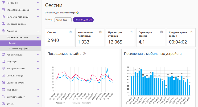 Сессии — показывает статистику пользовательских сессий на сайте средства размещения.