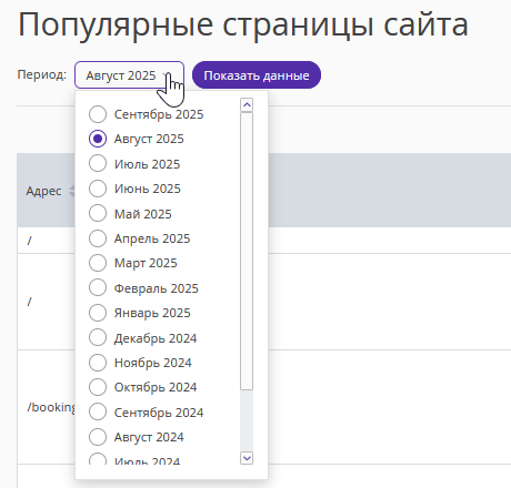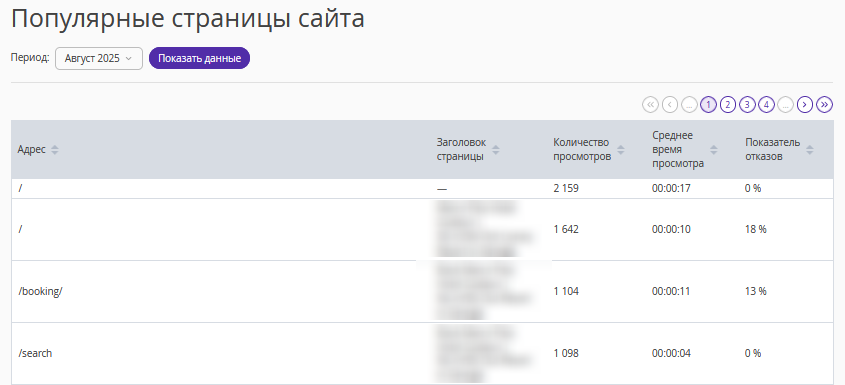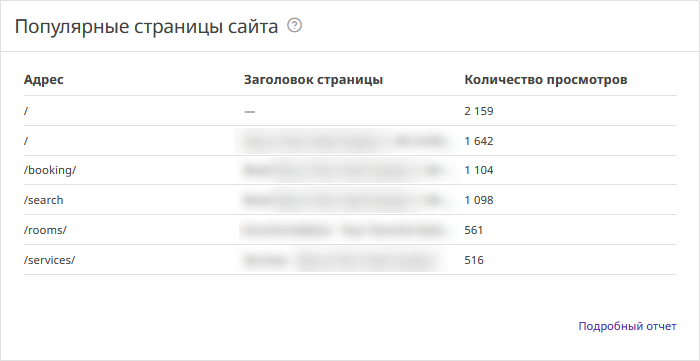 Таблица содержит список страниц сайта с наибольшим количеством просмотров за выбранный период. В таблице вы увидите столбцы: