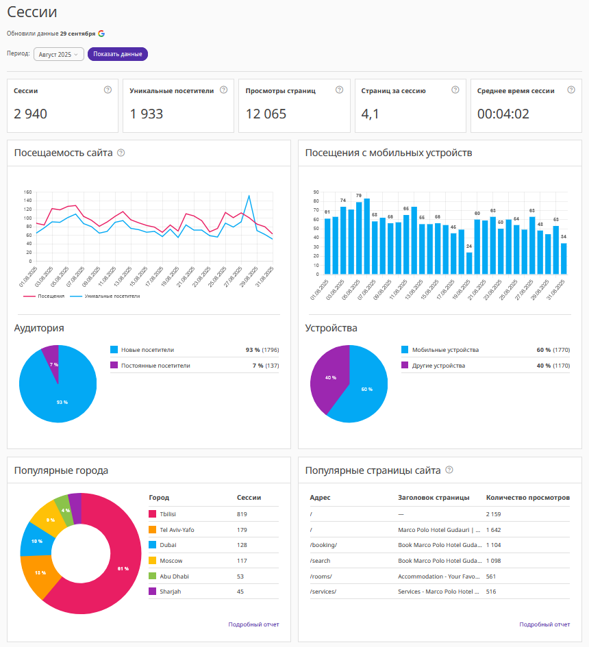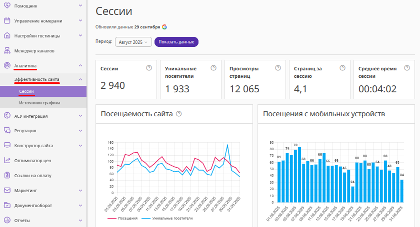 В разделе «Аналитика» → «Эффективность сайта» → «Сессии» показывается статистика посещений сайта: активность пользователей, их местоположение, продолжительность сессий и другие данные за выбранный период.