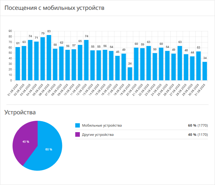 Блок «Посещения с мобильных устройств» показывает количество посещений сайта с мобильных устройств пользователями за выбранный период. В данном блоке представлен график «Посещения с мобильных устройств» и диаграмма «Устройства».