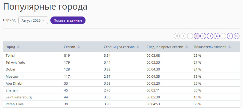 На диаграмме «Популярные города» показаны города, из которых пользователи чаще заходят на сайт, и количество сессий за выбранный период.