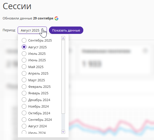 1. На странице «Сессии» в пункте «Период» в раскрывающемся списке выберите месяц, за который вам нужно сформировать отчет.