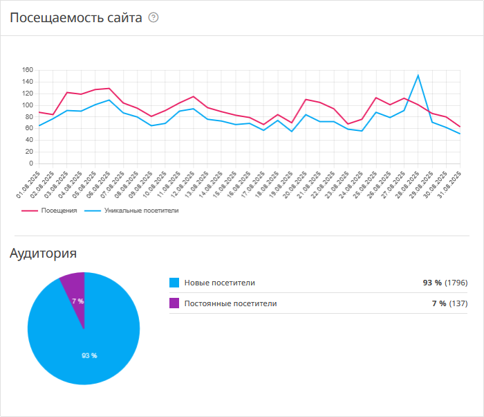 Блок «Посещаемость сайта» отображает количество посетителей, которые перешли на сайт из разных источников, за выбранный период. В данном блоке вы увидите график посещаемости сайта и диаграмму «Аудитория».