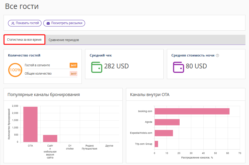 На вкладке «Статистика за все время» отображается данные по сегменту за весь период сбора данных, который вы установили при настройке Exely Guest Relations.