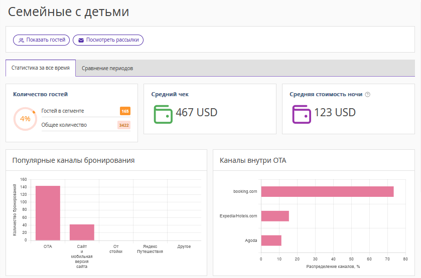 Блок показывает количество гостей с детьми, которые совершили бронирование в первом или втором периоде, установленном в фильтре.