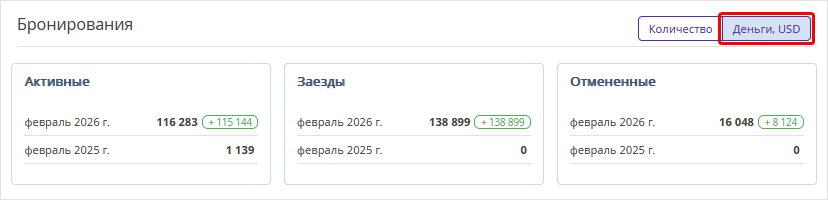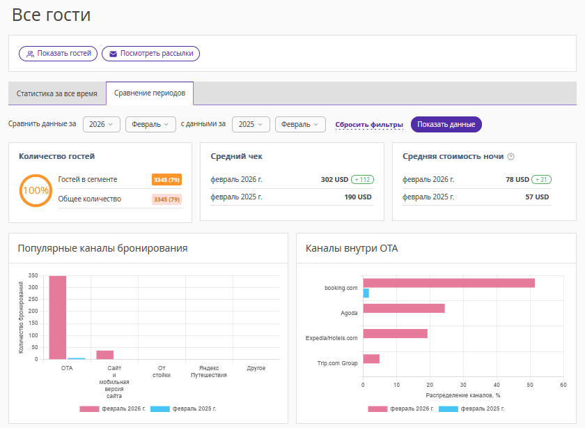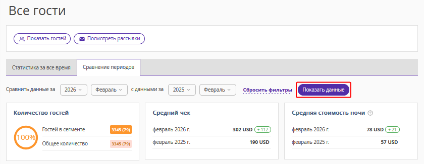 Второе число — количество гостей, которые совершили бронирование во втором периоде, установленном в фильтре, и не отменили его.