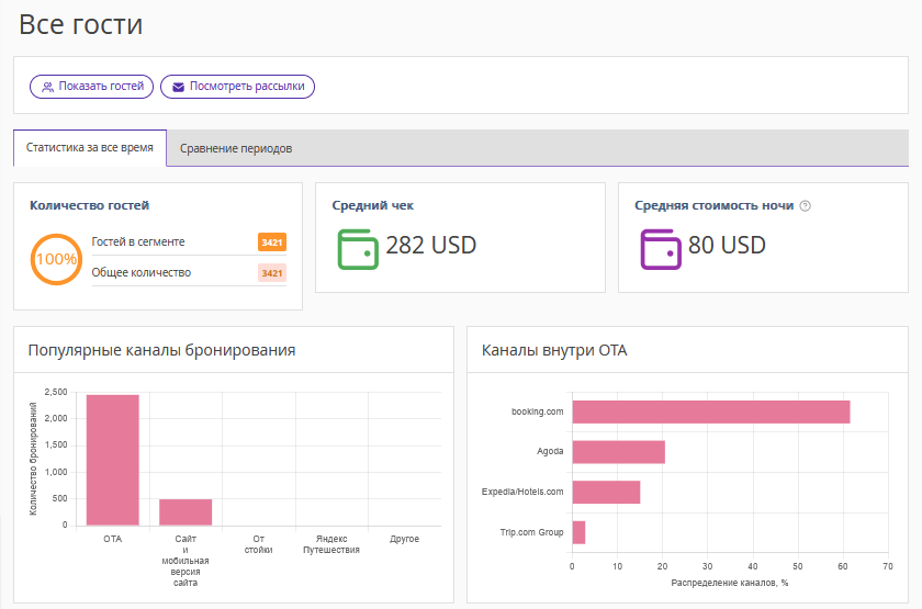 На вкладке «За все время» отображаются данные за весь период сбора данных. Читайте подробнее «Как узнать, за какой период собраны данные о гостях в Exely Guest Relations».