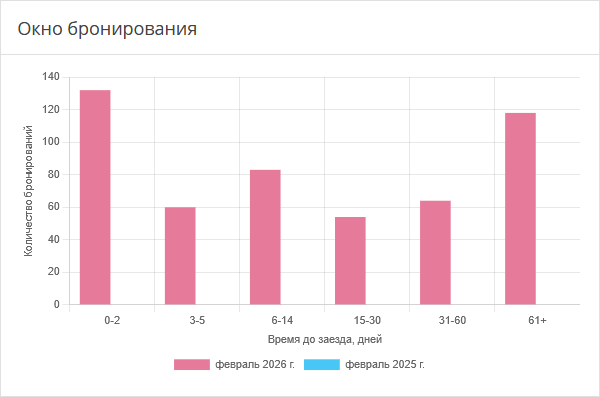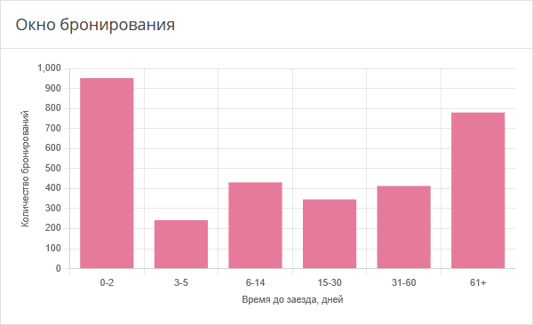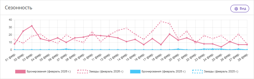 График показывает изменения в количестве бронирований и заездов с разбивкой по дням периода. Это позволяет выявить даты высокого и низкого спроса.