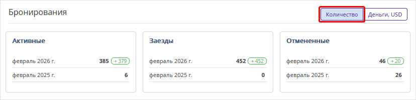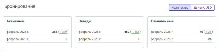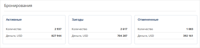 Блок отображает статистику активных и отмененных бронирований и заездов.